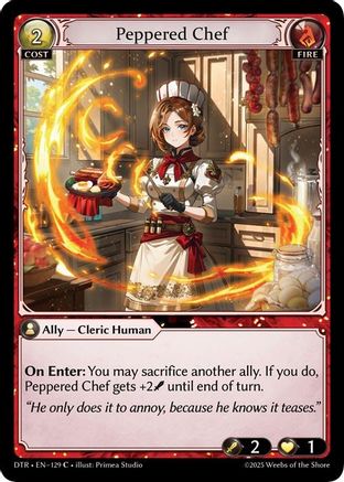 On Enter: You may sacrifice another ally. If you do, Peppered Chef gets +2 power until end of turn.