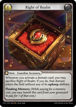 Whenever you activate a domain card, you may sacrifice Right of Realm. If you do, that domain enters the field without any of its upkeep abilities.